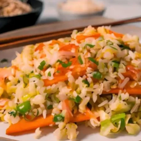 Arroz salteado con guisante, cebolla, zanahoria y huevo